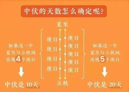 由于夏至和立秋的日期几乎固定,所以中伏的天数取决于夏至与立秋之间有几个庚日:如果有4个庚日,那么第五个庚日便是立秋后第一个庚日,这样中伏有10天,三伏共30天;如果有5个庚日,那么立秋后第一个庚日则为夏至后第六个庚日,中伏有20天,三伏共40天。
