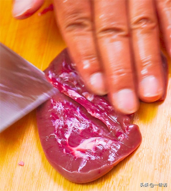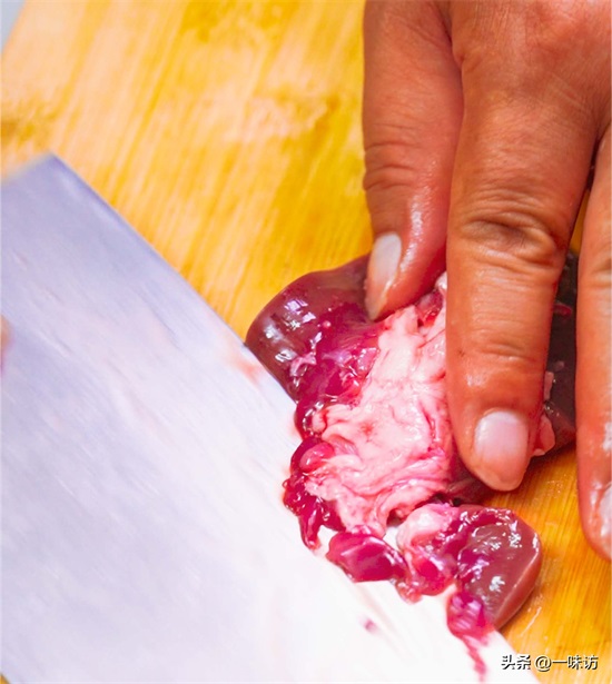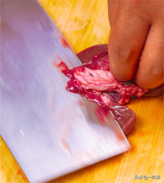 去除腰梢,是爆炒腰花最关键的一个部分,腰梢是猪腰腥味的主要来源。