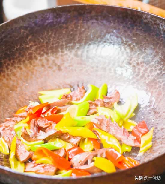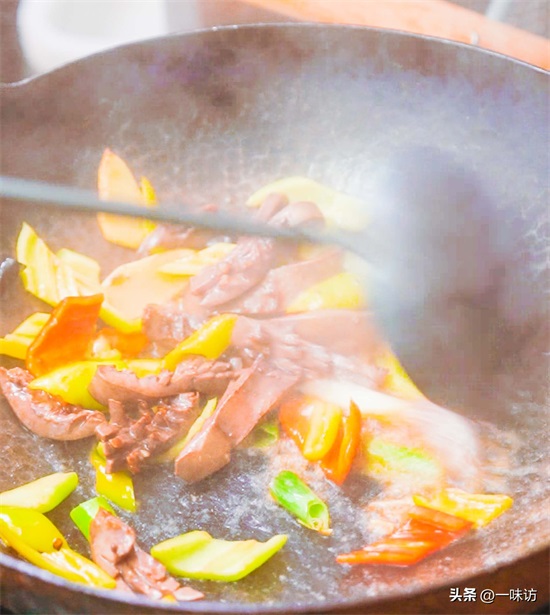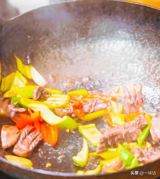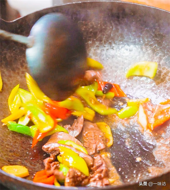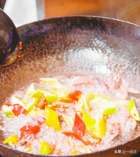 炸至卷缩成麦穗状后放入准备好的青红椒一起过油,让腰花快速吸收青红椒的香味。