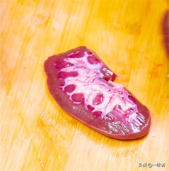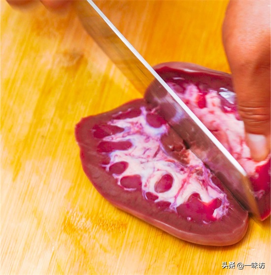 接下来我们将洗净的猪腰从中间切开,一分为二,这样更方便我们去除猪腰上的腰梢。