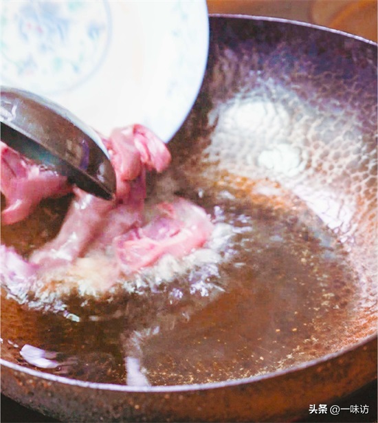 起锅烧油,油温升至五成热,把我们腌制好的猪腰倒入锅中油炸,油炸过的腰花又酥又嫩。
