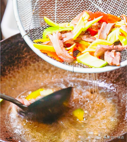 然后将过油后的猪腰和青红椒捞出放在一边控油,这样可以去除食物中多余的油脂,这一做法对我们自身的健康也有一定的帮助。