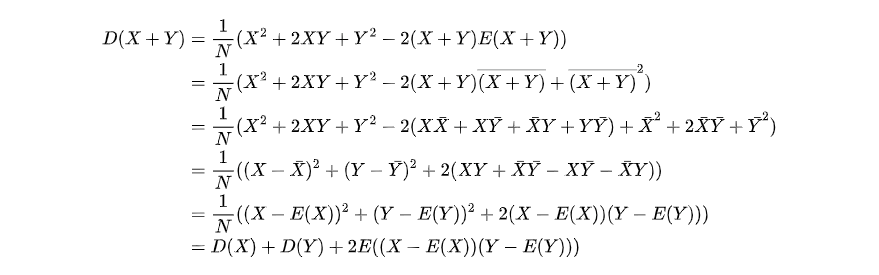 首先,我们来看一下D(X+Y),这里X和Y是两个变量,D(X+Y)就表示X+Y的方差,我们来看下D(X+Y)和D(X)和D(Y)之间的关系。