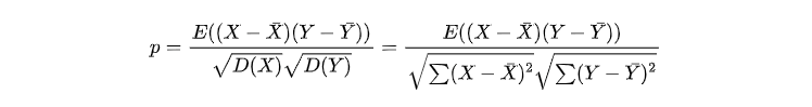 这个形式已经非常像是两个向量夹角的余弦值,它就是大名鼎鼎的皮尔逊值。皮尔逊值和余弦值类似,可以反映两个分布之间的相关性,如果p值大于0,说明两组变量成正相关,否则则成负相关。我们可以通过计算证明p值是一个位于-1到1之间的数。