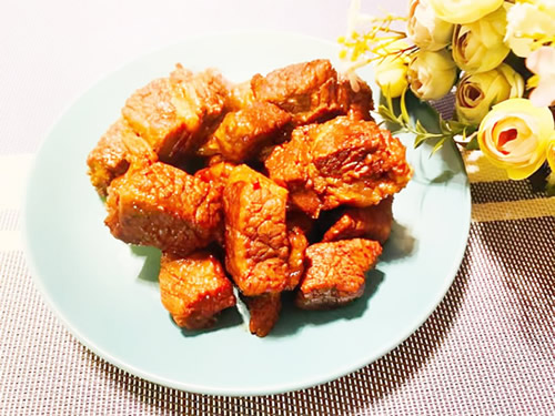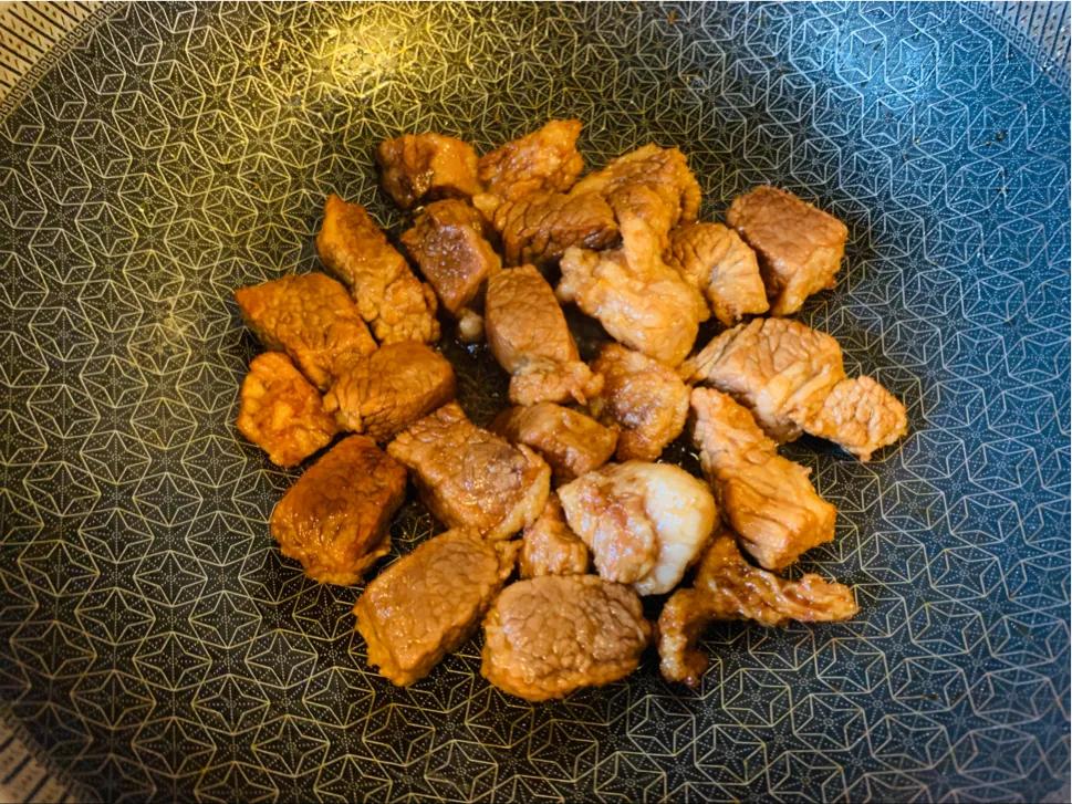 1.热锅凉油,倒入适量的食用油,放入冰糖碎,小火慢慢炒制冰糖化开,最后变成棕红色,放入焯好水的牛肉,快速翻炒至牛肉表面均匀的裹上糖色。