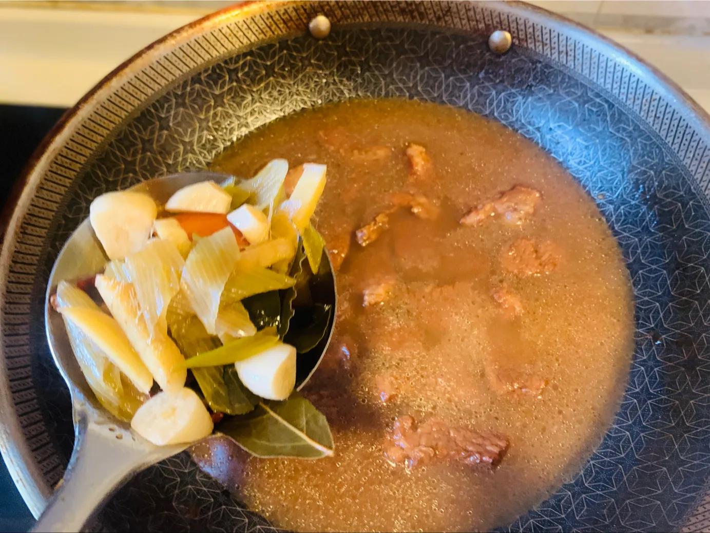3.大火煮制到时间后,再放入盐,挑出里面的料头,然后转至小火慢慢炖上1个小时,就这样牛肉就炖好了。