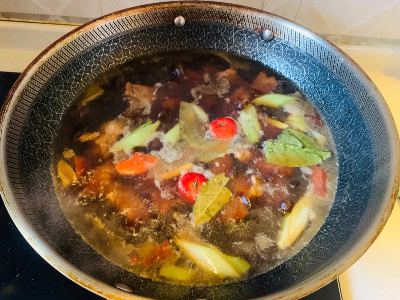 2.然后放入葱、姜、蒜、八角、桂皮、草果、白芷、草寇、小茴香炒制出香,倒入没过牛肉的开水,再放入2小杯的白酒,生抽、老抽大火煮制30分钟。