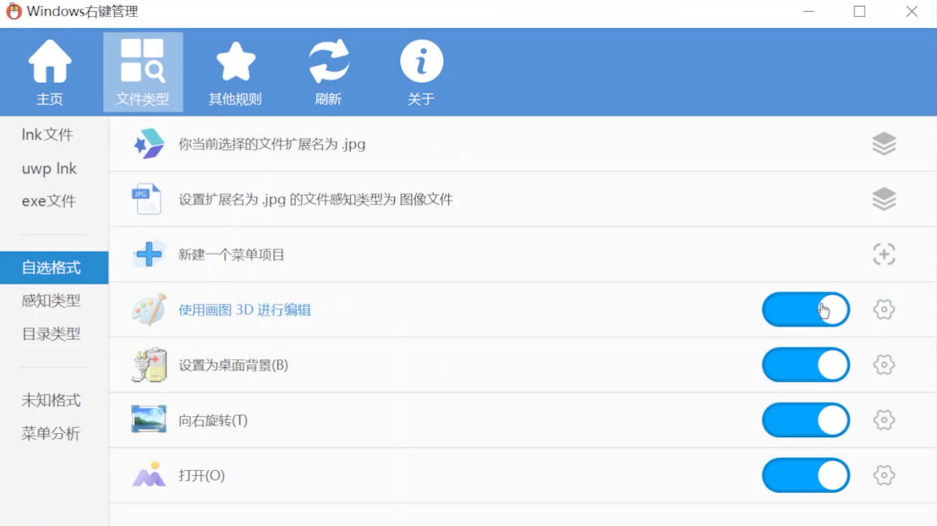 软件就会直接列出这个文件所属的类型。如果要管理JPG格式文件的右键菜单,我们只需要点击这里右侧的箭头就可以显示菜单内容了,同样通过后面的开关就可以控制这个选项是否出现在你的右键菜单里。