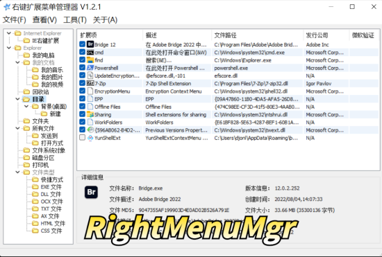 怎么样,是不是非常简单?而类似功能的软件比如“RightMenuMgr”它的界面是这样,你需要在众多很难分辨的项目中找到那个相关的才行,这一点“CMM管理器”要好用得多。