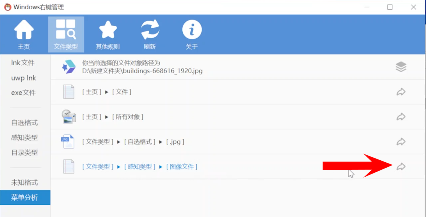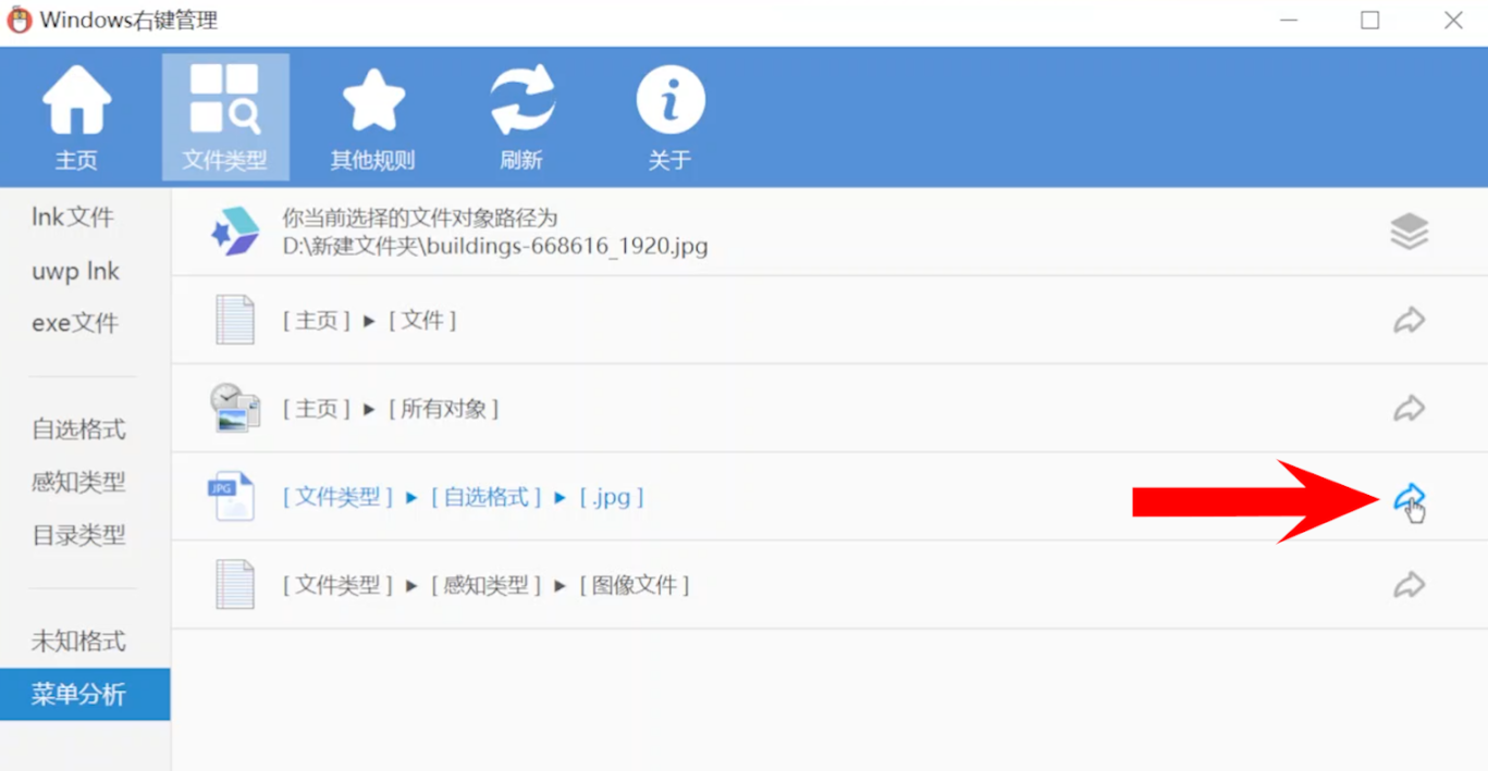 点击上面的“文件类型”,左侧我们选择“菜单分析”,比如我想管理JPG格式文件的右键菜单,只需要找到一个JPG格式文件,然后把它拖拽到软件里。