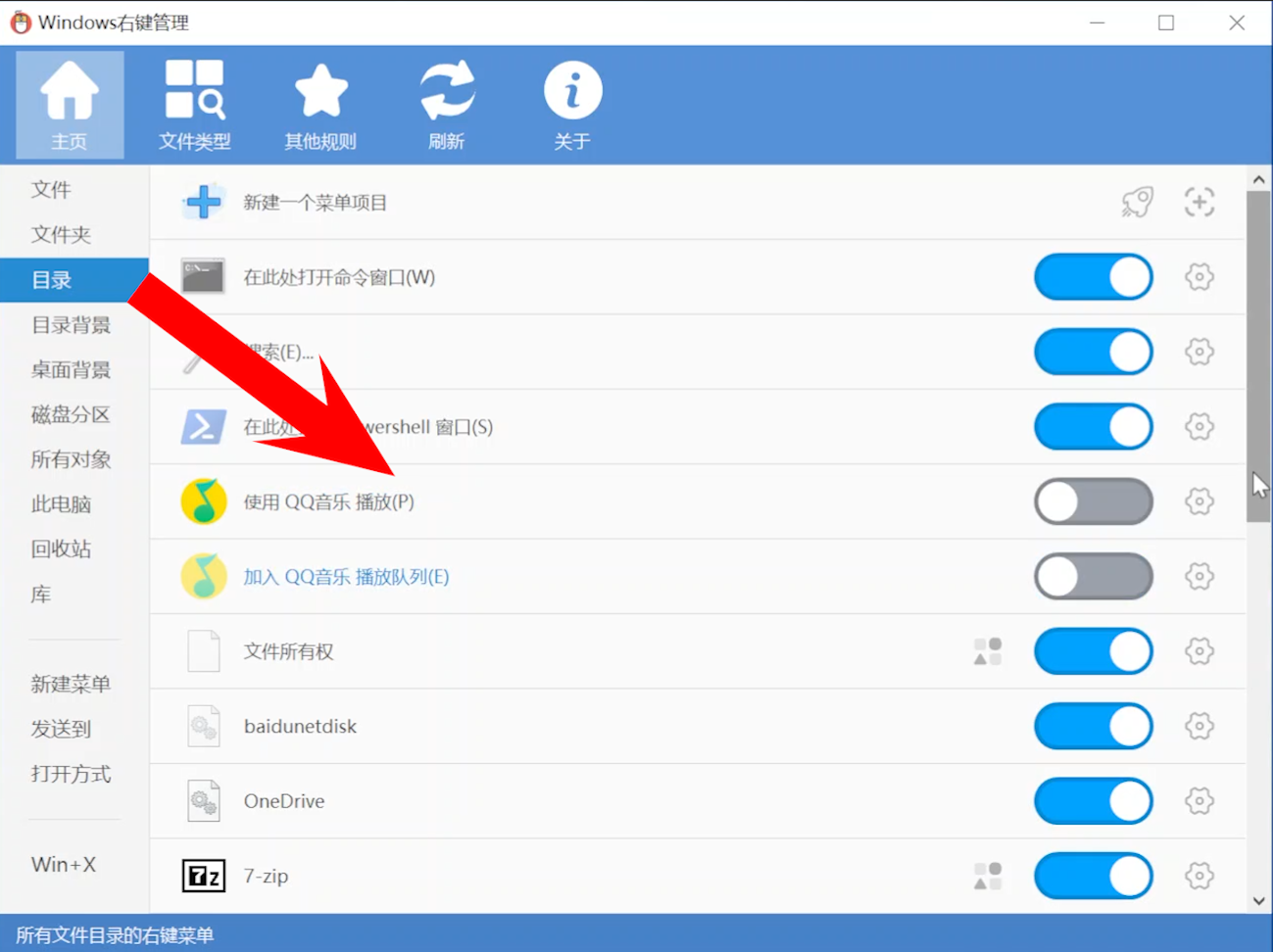 我们关了刚才的开关,文件的右键没有了,但目录菜单里还有,那怎么办呢?仍旧非常简单,在软件主界面上,左侧就是系统的各种文件相关的类别了。