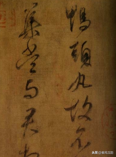 帖中的10多个字曲直结合:横竖较直,有刚劲之美;又有圆转外拓的曲笔,有遒婉之美,用墨巧妙自然,墨色有枯有润,变化丰富。章法上行距很宽,显得萧散疏朗,堪称是一幅不拘法则而又无处不存在法则、妩媚秀丽而又散朗洒脱的草书精品。