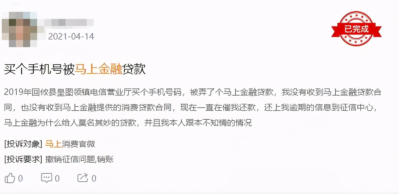 在黑猫投诉平台,今年4月14日,有消费者投诉“买个手机号被马上金融贷款”。