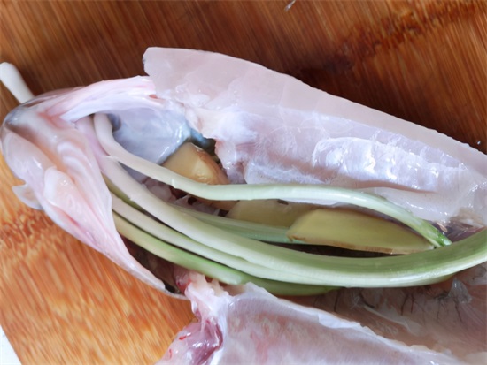 厨师长建议,用刀将鲈鱼从中间划开,呈“八”字形,这样就能让鱼“趴”在盘子上,这样中间的热气可以流通,两侧的鱼肉可以同时蒸熟,不会一生一熟的情况。处理好后,就可以腌制了。