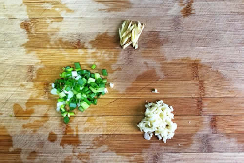 2.小葱清洗干净切葱花,姜切丝,大蒜去皮后剁成末。