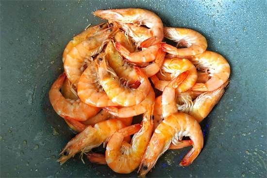 4.锅中放入植物油烧热,放入大虾大火爆炒几下,调中小火炒至变红、虾壳有些干瘪,这时候要把大虾炒到七分熟最合适。
