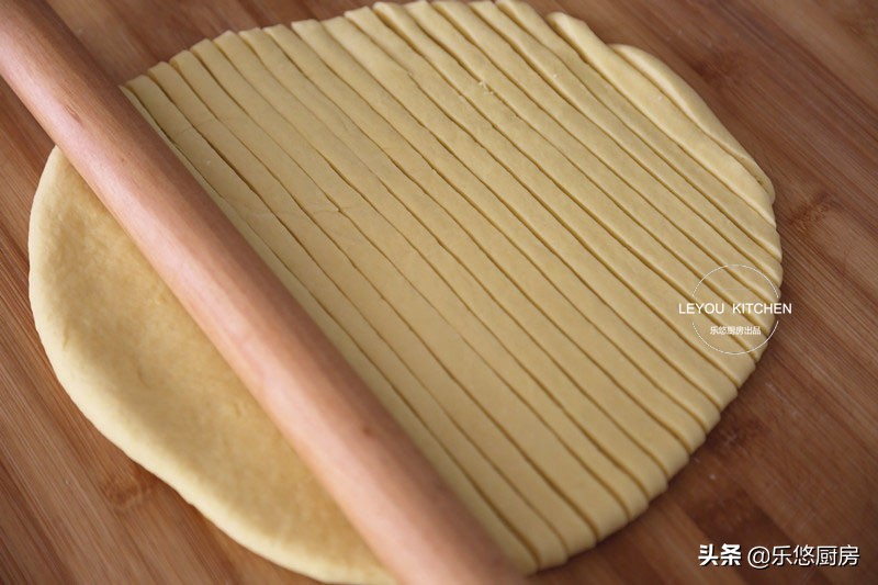 第五步:比着擀面杖,将面饼切成均匀的细长条,如图。