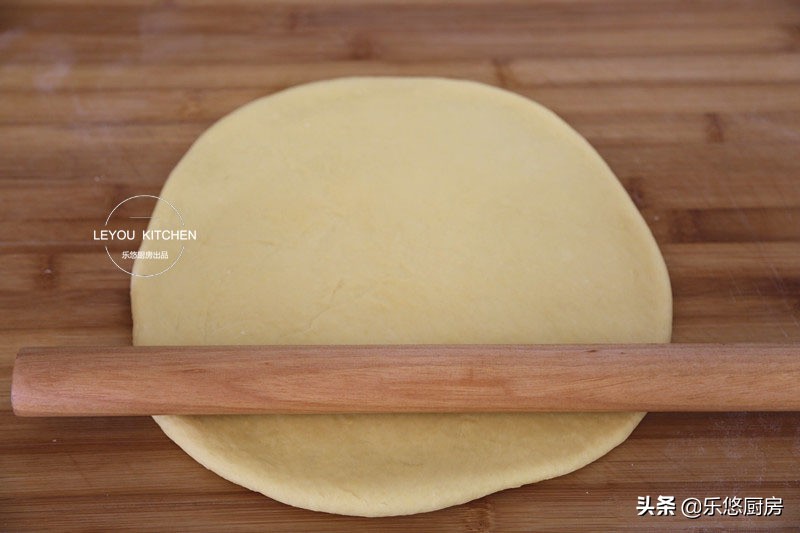 第四步:把面团取出稍稍揉圆,然后擀成5毫米厚的大面饼,如图。