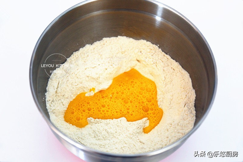 第二步:把白糖、盐、小苏打放入面粉中,然后倒入搅打均匀的蛋液和水。