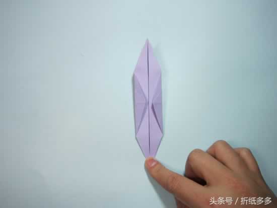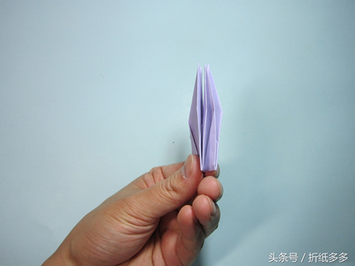 第16步、捏住左右两侧的顶角往下拉,形成千纸鹤的翅膀。将中间拉的凸起来。如图所示。
