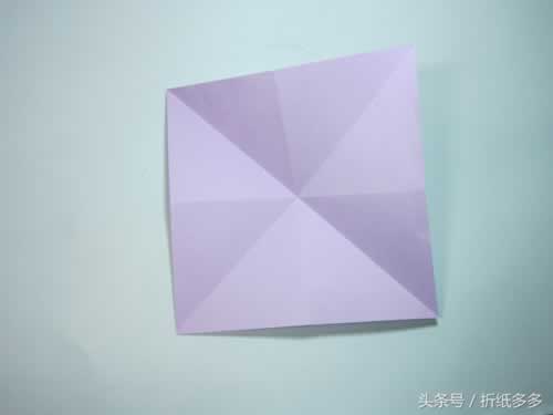 第2步、翻面。四个角分别沿着对角线对折,展开,形成米字型折痕。