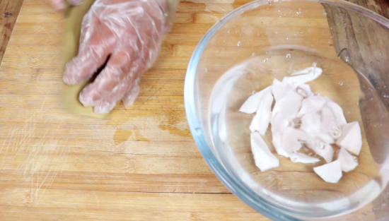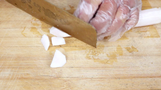去皮的山药放在加了白醋的清水里面清洗干净,白醋能更好的去掉山药表面的黏液,洗干净的山药斜切成滚刀块,浸泡在水中备用,能避免山药氧化;