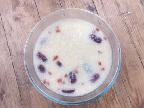 准备原材料:小米100g、大米50g、山药半根、枸杞、红枣、冰糖;