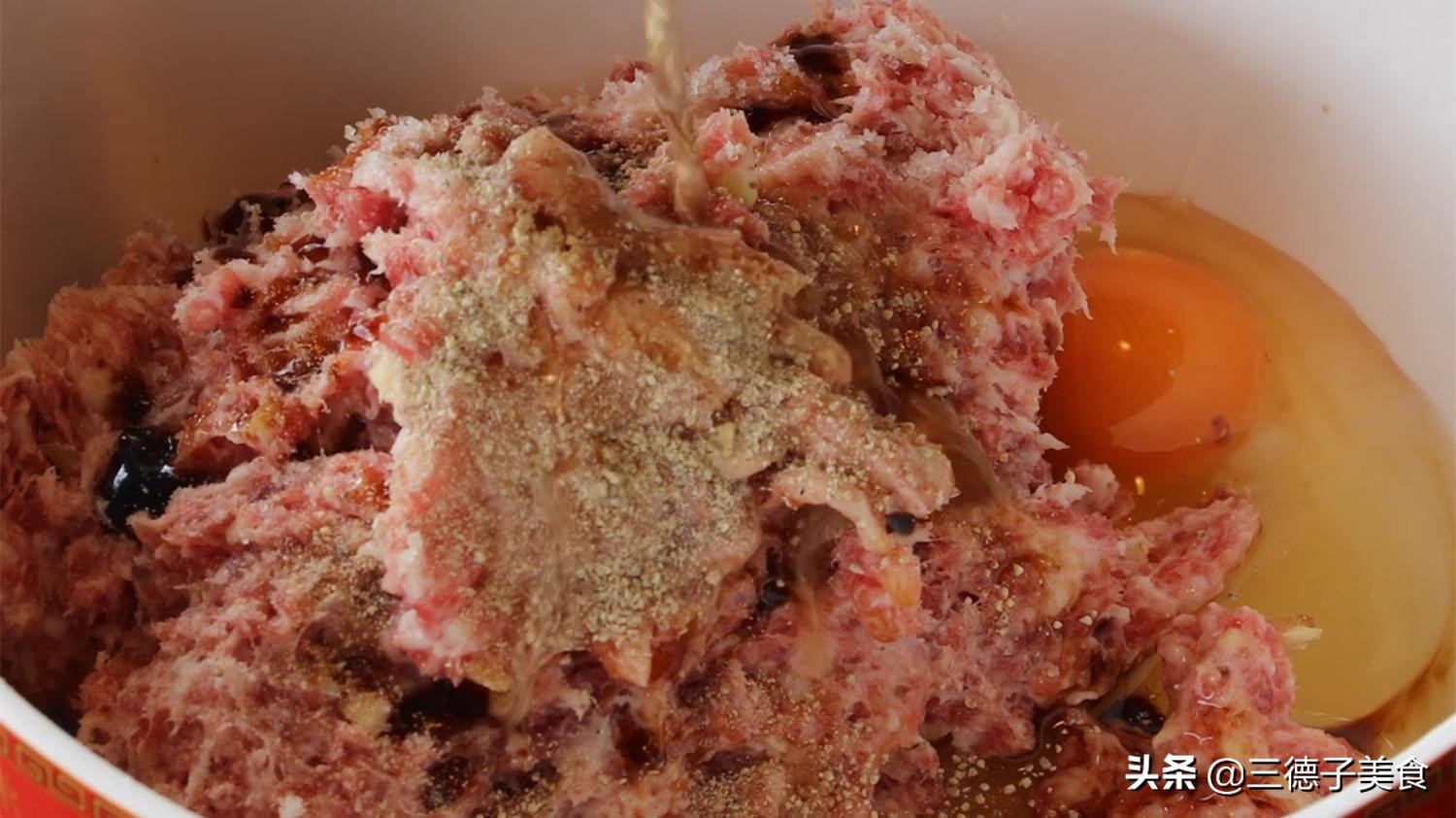 2、肉末里加生抽(可用味极鲜酱油)、盐、两个鸡蛋、胡椒粉、少许料酒,抓匀抓上劲,然后加入淀粉水(肉馅吃起来更鲜更嫩),继续搅上劲。