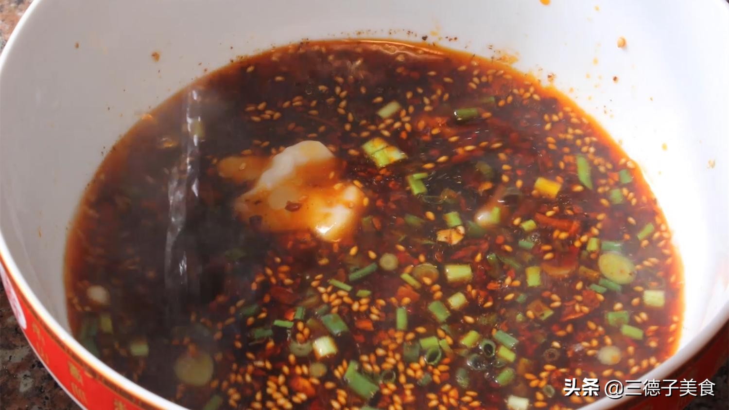 4、打蘸料:(1)红油:碗里加生抽、蒜末、陈醋、花椒粉、味精、葱花、红油、白糖,一勺开水。(2)清汤:蒜末、葱花、胡椒粉、味精、盐、猪油,一勺开水。