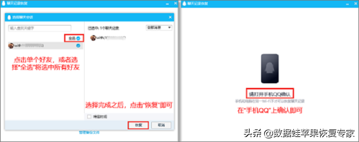 第3步:在新界面中我们可以看到选择单个好友或者是全部好友来恢复聊天记录,勾选完成以后点击右下角【恢复】即可。