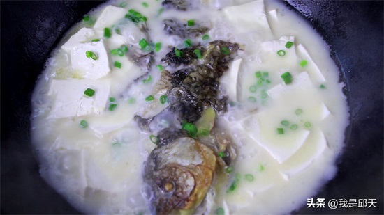 20分钟过后我们可以往里面加入几块嫩豆腐,鲫鱼汤加豆腐是绝配,豆腐不需要煮太久,大概再煮上5分钟的样子就可以了。最后撒上一点葱花就可以起锅了。