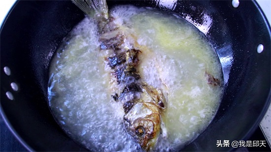 在鱼下锅之前我们要先将鱼身上的水分吸干,以免等下煎鱼的时候,因为有水而出现崩油的情况。现在我们开始来煎鱼,要想鱼不煎破皮就要热锅冷油,也就是先将锅烧热,改小火然后再倒油,放入一点食盐,然后把鲫鱼放进锅里,再开中火慢慢煎,等鱼的一面煎定型后,再翻一面继续煎,煎到鱼的两面有点微黄的时候,再加入开水。要想鱼汤又浓又白,第一点鱼要稍微多煎上一会,第二点就是我们煮鱼汤要用开水,水量要一次性加足,可以稍微多加点,因为在煮的过程中水分还会蒸发掉一点,中途不再加水的鱼汤也会更浓。