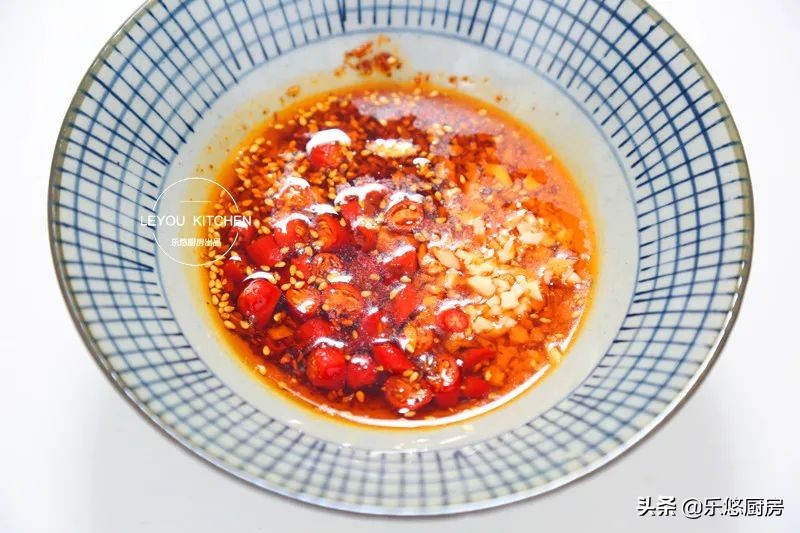 第五步:锅中倒入少许油烧热,然后把热油倒入碗中,如图。这时可以闻到辣椒和蒜的香气。