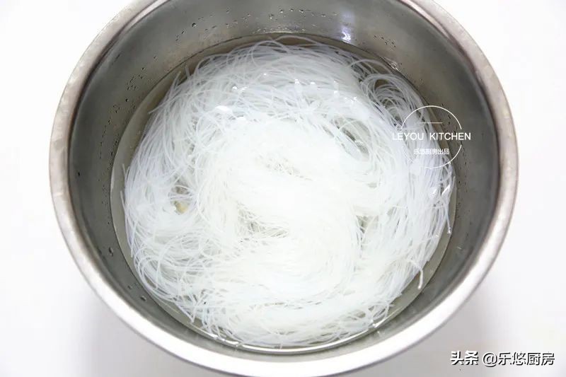第三步:锅中倒入一些水烧开,把粉丝放入锅中焯30秒,然后捞出放入凉水中。