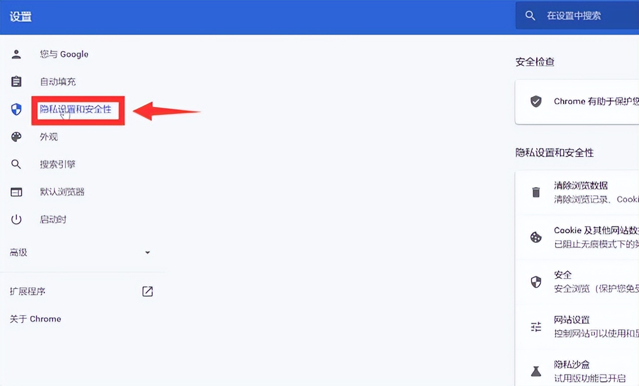打开Chrome浏览器可以看到浏览器右上角有三个点,我们点击一下选择设置。进入设置页面后,我们点击左侧的“隐私设置和安全性”。在选项栏中选择“Cookie及其他网站数据”,按照下面的提示步骤,打开对应的两个功能选项。