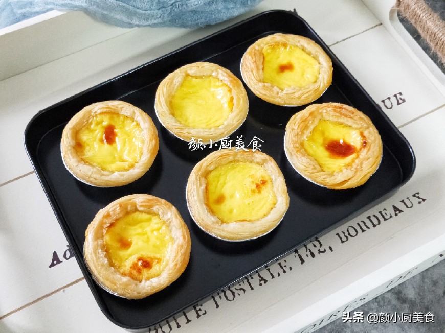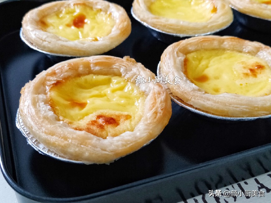 第七步:烘烤至表面金黄,就是蛋挞皮酥脆,蛋挞液膨胀起就是烤好了。