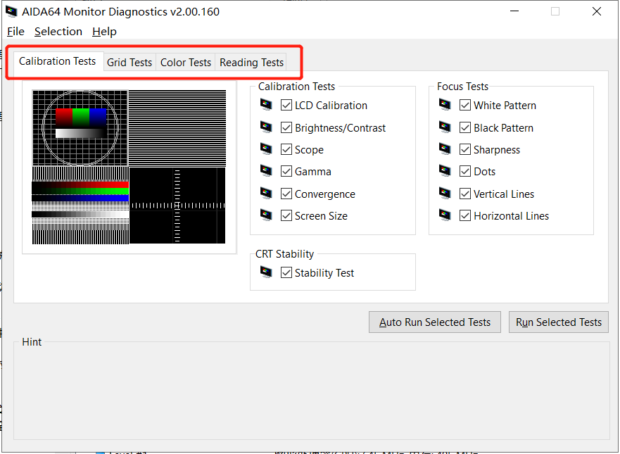 随后如图2所示,跳出显示器检测页面。这个页面文字都是英文,但是不要慌,笔者一一为大家讲解。如图2红框中所示,从左到右选择项中Calibration Tests指校准试验、Grid Tests指网格试验、Color Tests指颜色试验、Reading Tests指阅读试验。