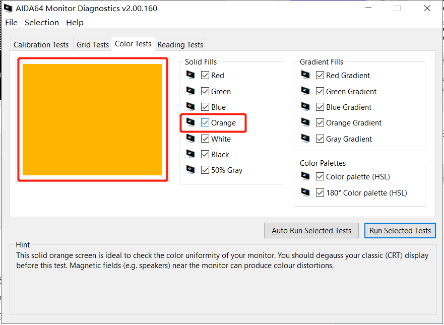 当选择自动运行时,AIDA64会自动运行所有颜色试验方式直到我们退出,