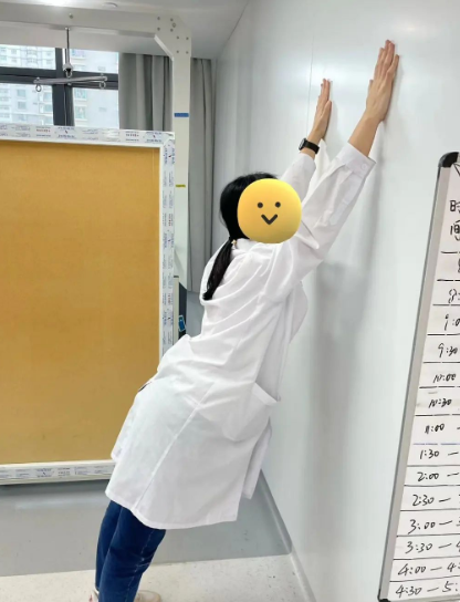 双肩使劲贴住墙面,双上肢做外旋动作上举,靠墙贴住,坚持1-3分钟。