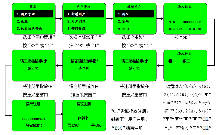 在进入”输入姓名”或”修改名称”时,下方提示”拼”则为拼音输入状态,如输入”张三”可按以上新增用户时的步骤输出”张三”。如要输入”TOM”,可在进入”输入姓名”或”修改名称”时,按键盘”POWER”改变输入状态为”ABC”,并键盘输入”8″”1″(T)、”6″”3″(O)、”6″”1″(M)”OK”完成输入。其它名字可依此类推。