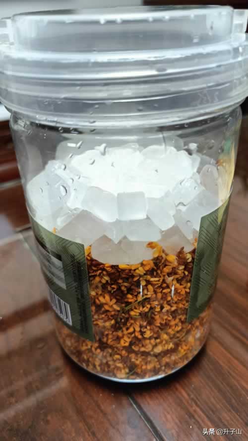 不知是累了还是烦了,耐心也不见了。只想早点完成装瓶工序。原理上是一层桂花压一层冰糖,再在上面盖一块洗净的卵石,把漂浮的花瓣压实。我图省事,把桂花放在下面,上面压满冰糖,盖上放常温下保存。等冰糖全部融化后,再在上面浇点蜂蜜,把桂花全部浸泡进去。