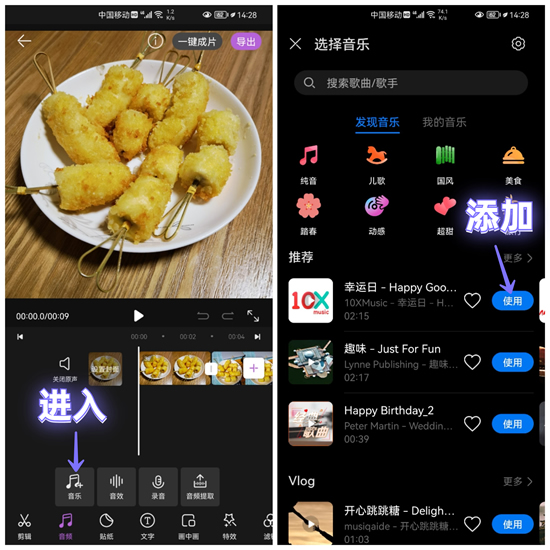 随后照片就被制作成视频了,你可以点击底部的「音频」,选择「音乐」,这里支持搜索歌曲,点击「使用」即可添加到视频中。