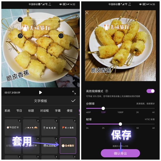 此外,你也可以从「文字模板」中添加字幕, 相对来说更高级一些! 最后导出视频,如果是发朋友圈,就选择「720P,30帧」。