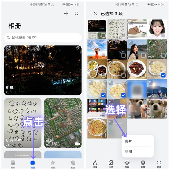 首先我们打开手机相册,查看所有照片,进入后长按一张图片,然后批量勾选,接着再点击底部的「创作」,选择「影片」功能。