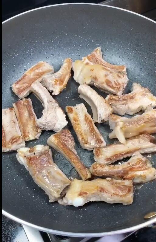 3、锅中烧油,油热下入排骨煎至两面金黄;