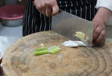 1、排骨剁成均匀长块,姜切片,葱切段取葱白部分,大蒜切小块,蒜苗切小段备用;