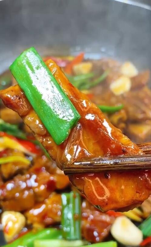 6、半小时后加入蒜块,青红辣椒块,蒜苗,翻炒均匀,大火收汁即可;