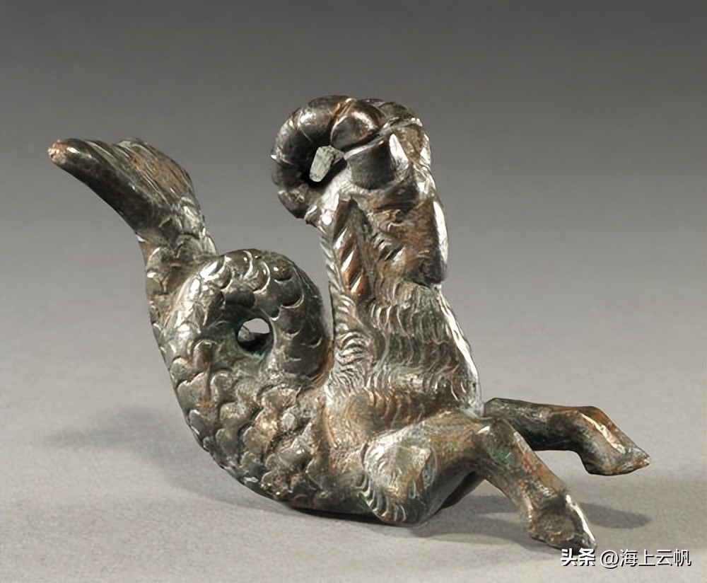 古罗马银镜背面的图案,佛里克索斯骑着金绵羊,一只手抓住他的妹妹赫勒,天空中的女神是他们的母亲涅斐勒。