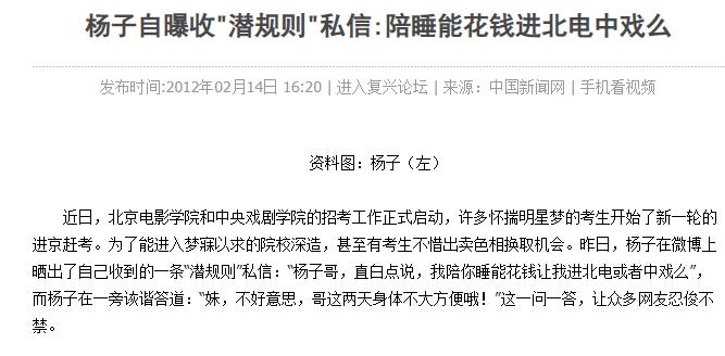 贵圈或许有一些 " 香艳 " 传闻,比如当年就有某女艺人读书时传出被教授 " 潜规则 ";杨子还爆料过,自己收过一些 " 潜规则 " 私信,有人问他:" 陪睡能花钱进北电中戏么?"