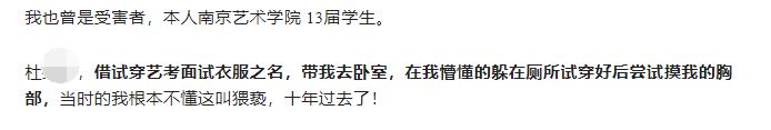 如果学生还算顺从地学完了课程,那么到了艺考前的面试阶段,杜老师还会使出第二招:以 " 试衣服 " 为由对学生进行骚扰。